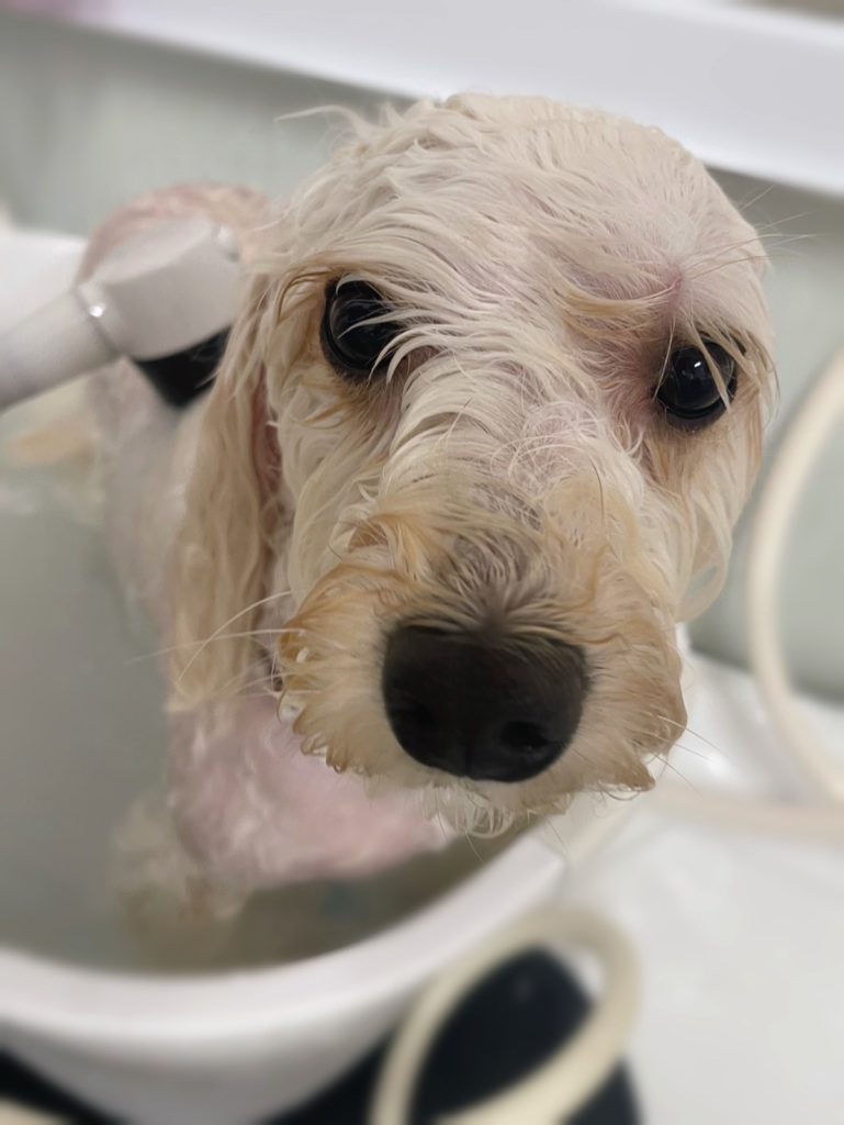 今回のオーダーは、全身6.4mm、四肢16mm、お顔すっきりまあるく、お耳1cmカット、しっぽ伸ばして行くためそろえる程度、高濃度炭酸泉スパコースでした。