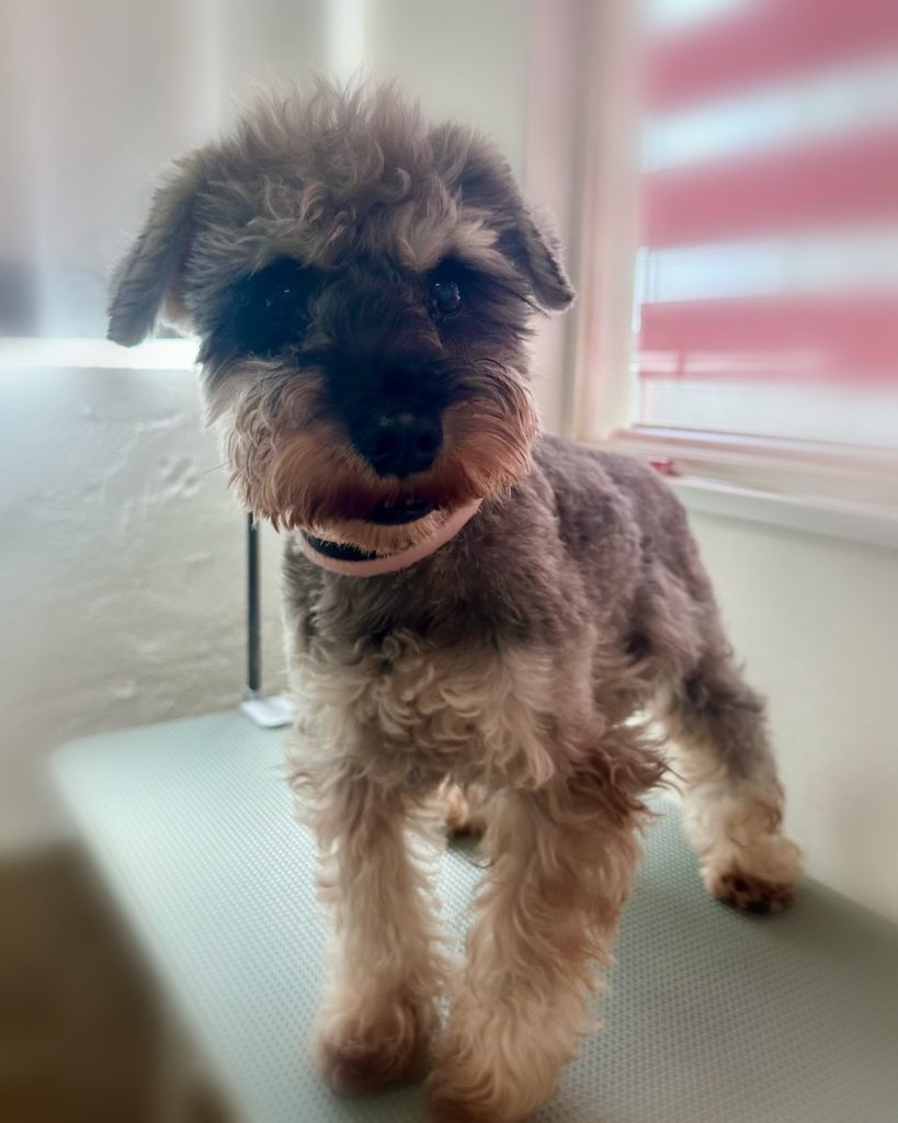 今回のオーダーは、お体2mmシュナライン、四肢細めストレート、お顔シュナウザーカット、お口周り小さめでまあるく、眉一体化、頭ソフトモヒカン、お耳&しっぽ2mm、まつげ2.5cm残しでした。