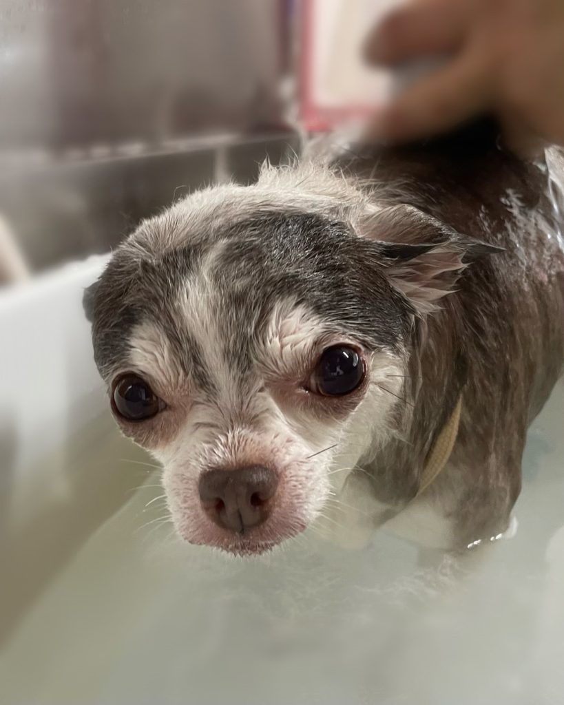 ティナちゃん。炭酸泉温浴と~っても気持ちよさそうでした~。お仕上がりもツヤツヤになりました~。😝😝😝