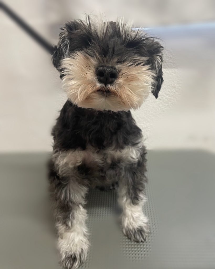 今回のオーダーは、お体3mm、四肢6.4mm、四肢先1mm並(ライン入れる)お顔スッキリめのシュナウザーカット、まゆげ&お口周りまあるくでした。