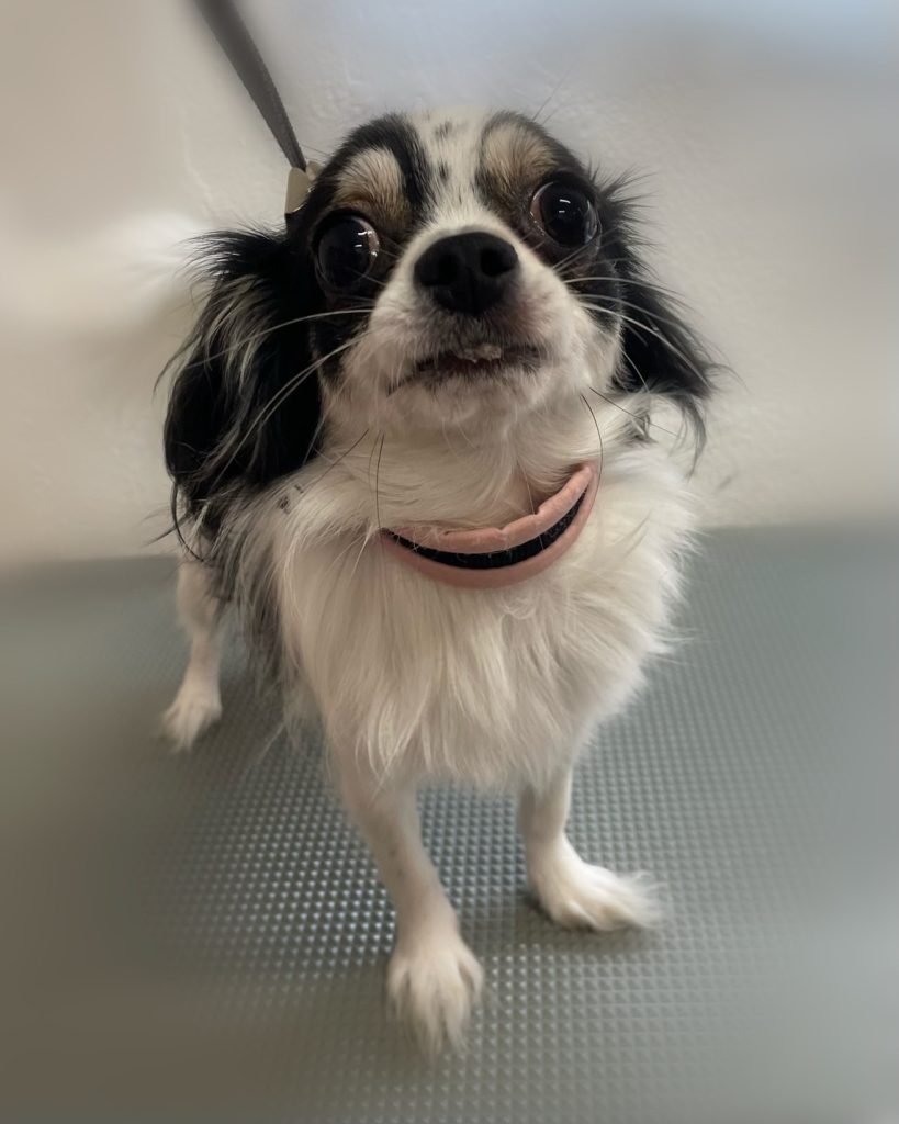 今回のオーダーは、全身アタッチメント付き10mm、お顔まあるく、お耳前スッキリ、しっぽ下側そろえる程度、マイクロバブルコースでした。
