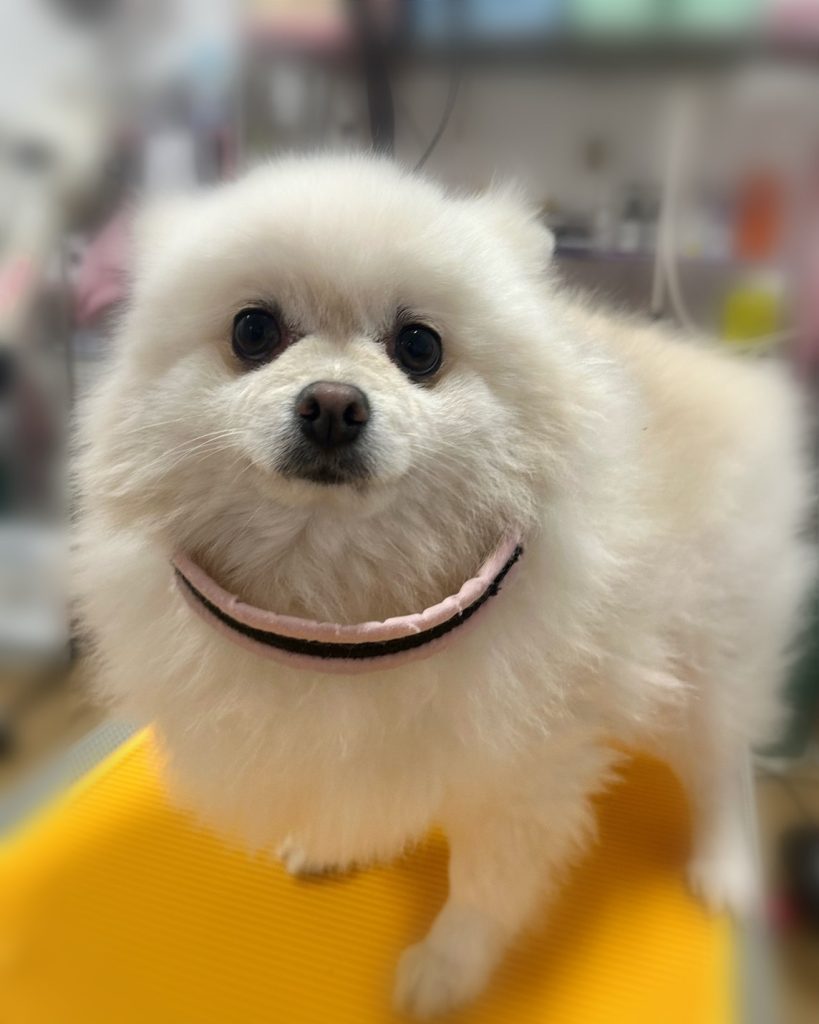 今回のオーダーは、背中からサイドアタッチメント付き32mm、胸ハサミでサイドにつながるようにまあるく、耳前カットして耳先まあるく、桃尻さん、しっぽ太目筒状でした。