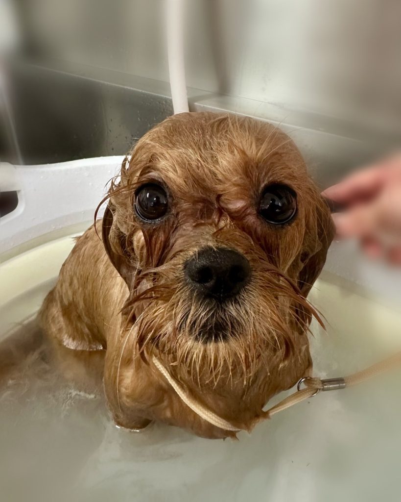 今回のオーダーは、全身6.4mm、四肢先3.2mm並(足止めする)、お顔まあるく、マズルふんわりまあるく、目周り短め、お口に入る毛短め、お耳顎ラインでそろえる、しっぽ2cmカットで扇形、まつげ残し、高濃度炭酸泉スパコースでした。
