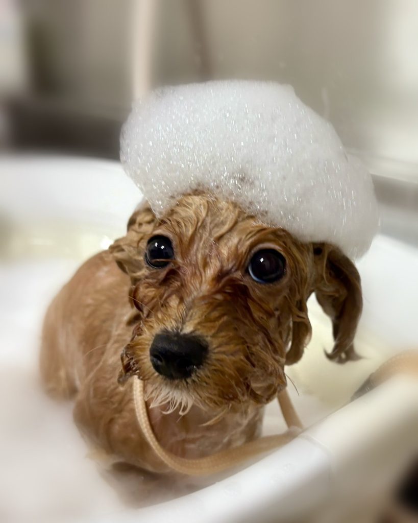 トリミングもと~ってもおりこうさんにできて毛玉予防効果のある高濃度炭酸泉スパコースもお試しいただきふわっふわっなお仕上がりに。🛀🛀🛀