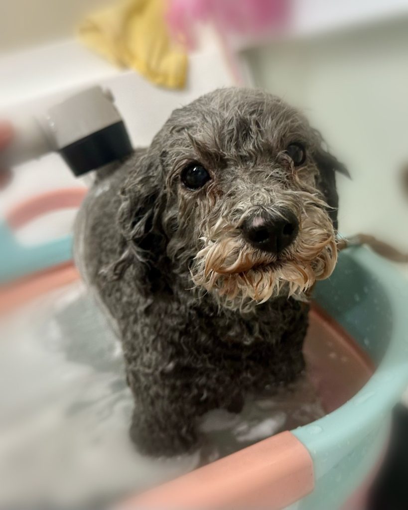 今回のオーダーは、お体9.6mm、四肢16mm、お顔目周りスッキリでお口周りまあるく、顎下短め、頭あまり低くしない、お耳表面16mmかけてふち(お耳裏2mm)、しっぽまあるく、足先バリカン、歯磨き、高濃度炭酸泉スパコースでした。