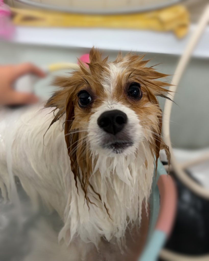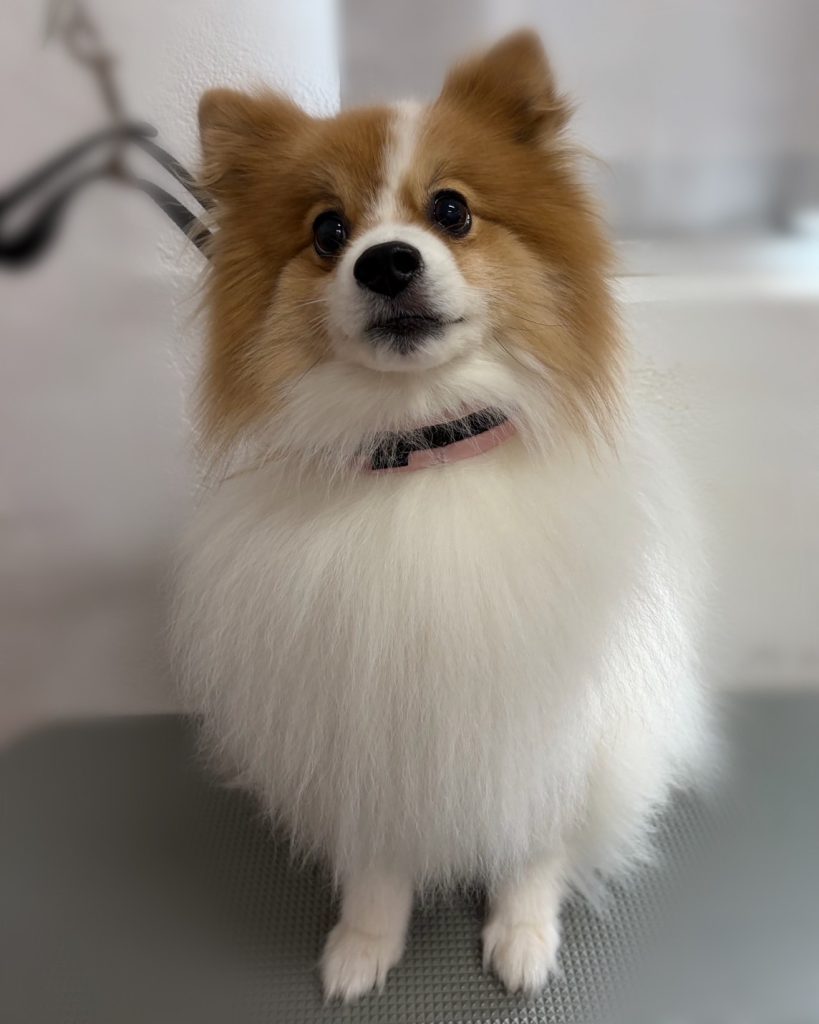 今回のオーダーは、前肢飾り毛スッキリ、アンダー6cmカット、お顔&お耳そのまま、そのほかそろえる、マイクロバブルコース+高濃度炭酸泉スパWコースでした。