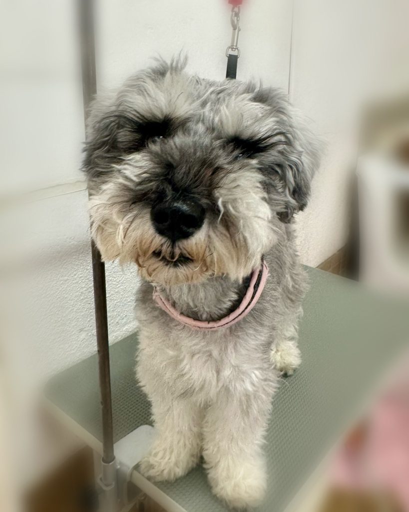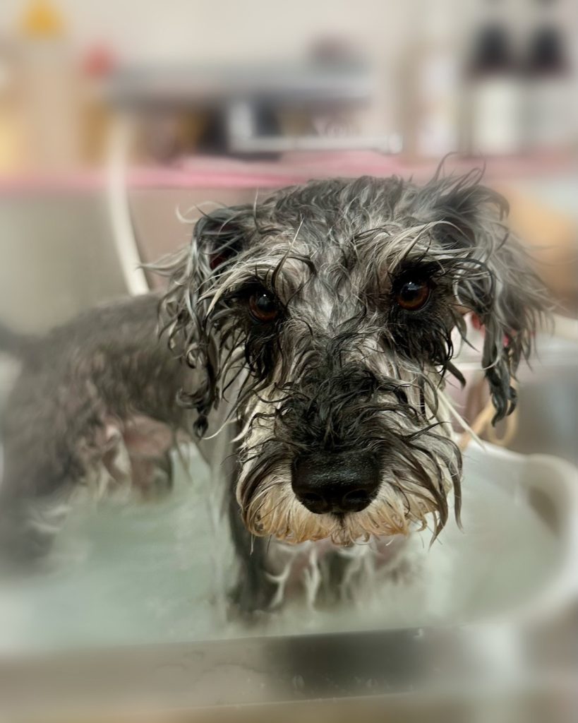 今回のオーダーは、お体3.2mmシュナライン、四肢16mm、アンダー短め3cm残し、お顔シュナウザーカット、眉毛まあるく、耳ふちから1cm残して形なり、お口周りまあるく、しっぽ2mm、まつげ3cm残し、歯磨き、マイクロバブルコースでした。