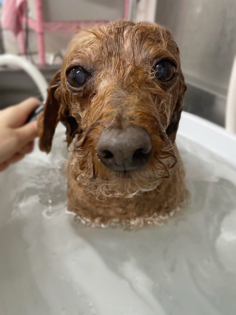 今回のオーダーは、お体6.4mm、四肢16mm、お顔お写真参照、お耳ふち1cm残してすそまあるく、まつ毛そろえる、足先バリカン、しっぽそろえる、歯磨き、マイクロバブルコースでした。