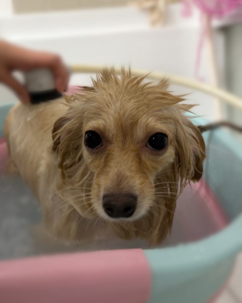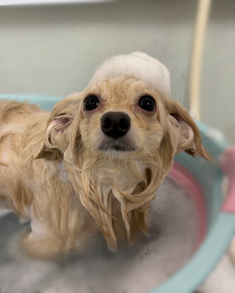 凪くん。炭酸泉温浴と~っても気持ちよさそうでした~。お仕上がりもふわっふわっで~す。😝😝😝