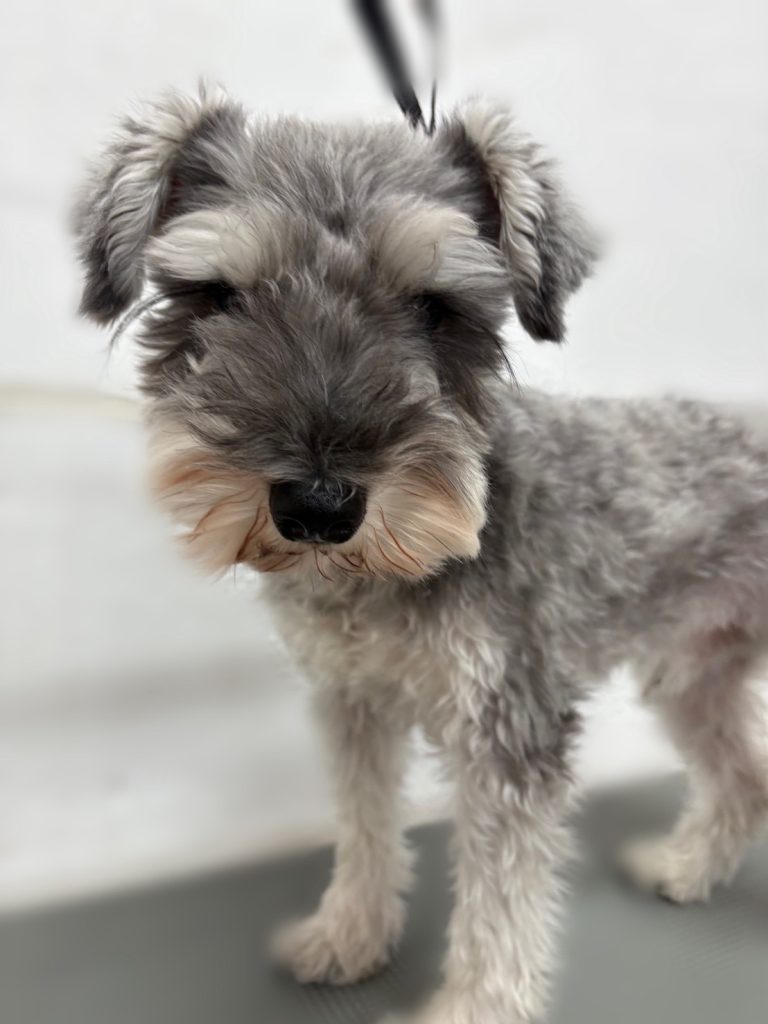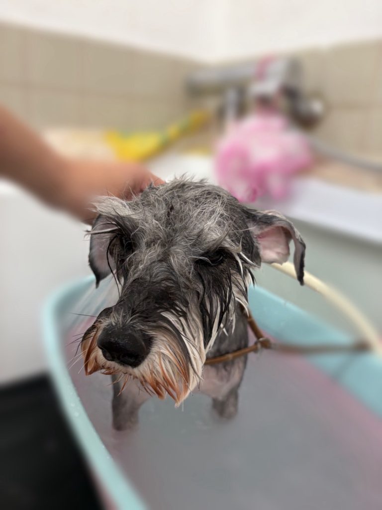 今回のオーダーは、全身6.4mm、お顔シュナウザーカット、眉毛まあるく、まつげ残し、お尻2mm、高濃度炭酸泉スパコースでした。
