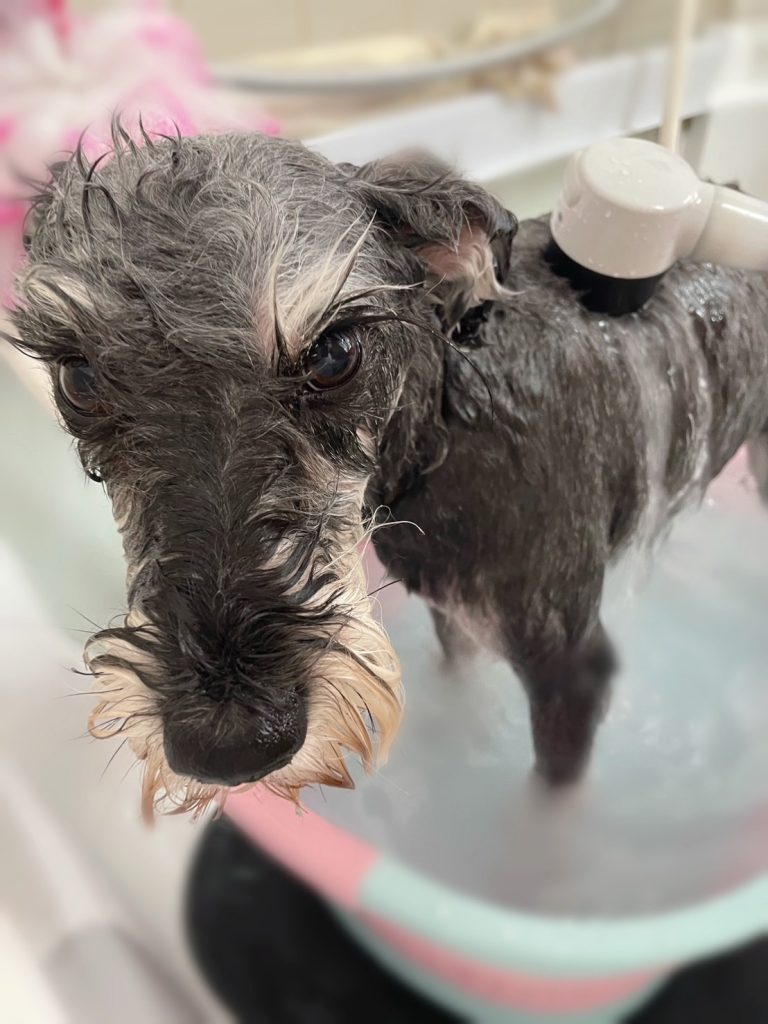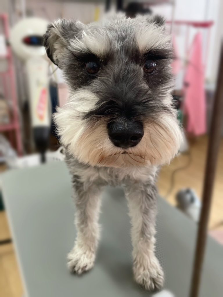 今回のオーダーは、全身6.4mm、お顔シュナウザーカット、眉毛まあるく、まつげ残し、お尻2mm、高濃度炭酸泉スパコースでした。