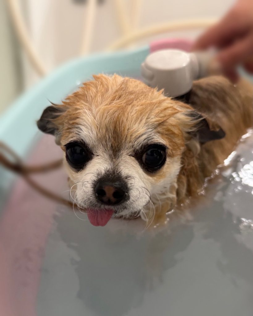 あずきちゃん。炭酸泉温浴と~っても気持ちよさそうでした~。お仕上がりもふわっふわっで~す。🎵🎵🎵