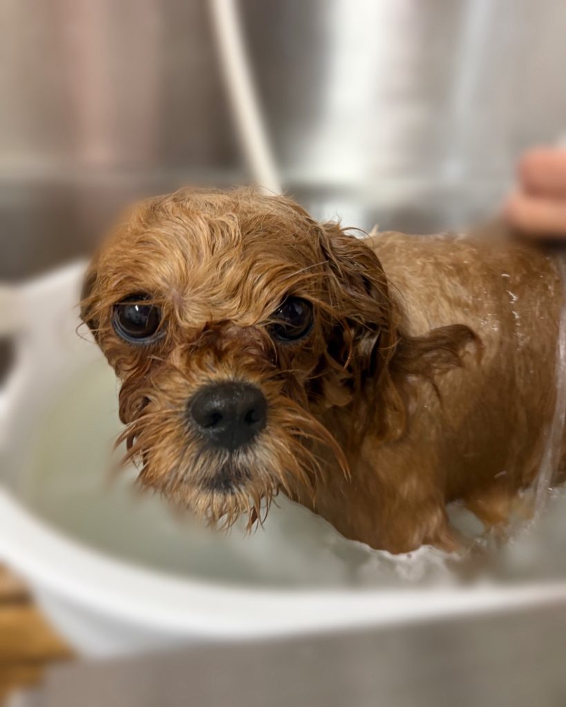 今回のオーダーは、全身6.4mm、四肢先3.2mm並(足止めする)、お顔まあるく、マズルふんわりまあるく、目周り短め、お口に入る毛短め、お耳顎ラインでそろえる、しっぽ2cmカットで扇形、まつげ残し、高濃度炭酸泉スパコースでした。