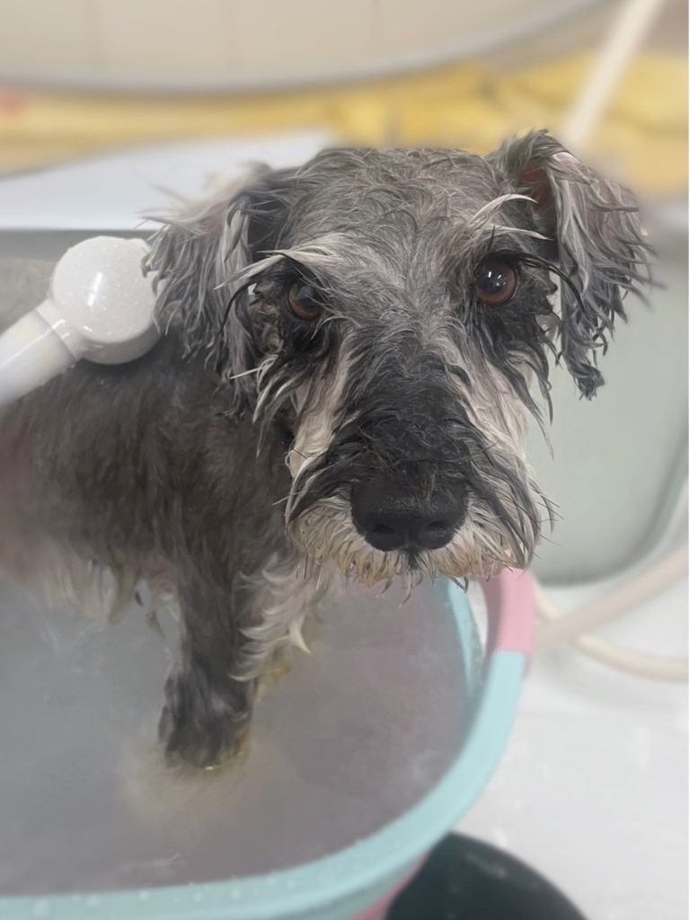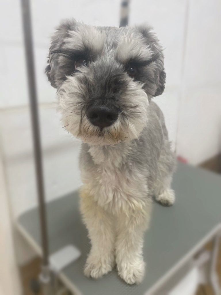 今回のオーダーは、お体6.4mmシュナライン、四肢16mm、アンダー短め3cm残し、お顔シュナウザーカット、眉毛まあるく、耳ふちから1cm残して形なり、お口周りふんわりまあるく、しっぽ2mm、まつげ3cm残し、歯磨き、マイクロバブルコースでした。