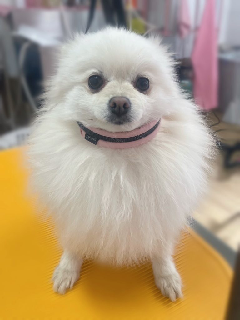 今回のオーダーは、背中からサイドアタッチメント付き32mm、胸ハサミでサイドにつながるようにまあるく、耳前カットして耳先まあるく、桃尻さん、しっぽ太目筒状でした。