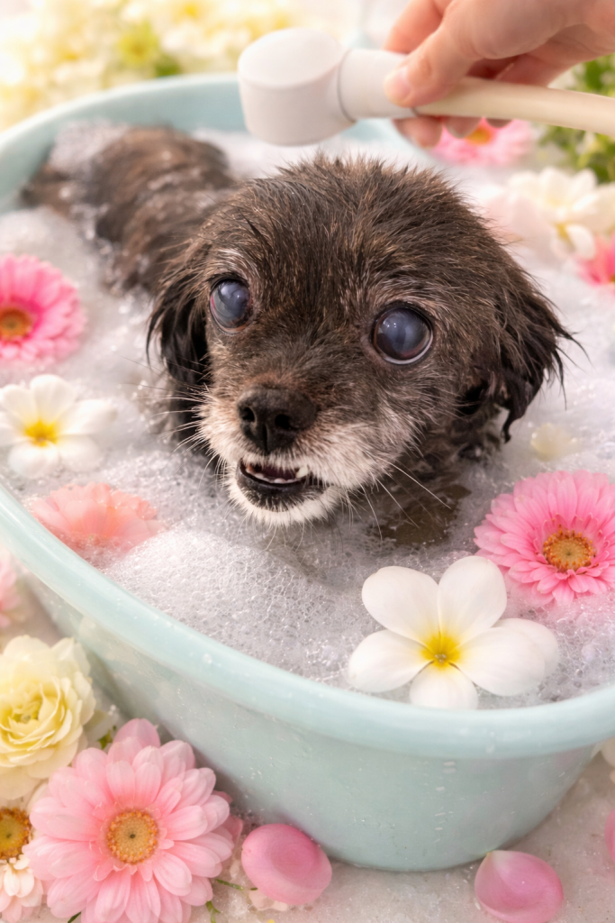 たんちゃん。高濃度炭酸温浴と~っても気持ちよさそうでした~。お仕上がりもふわっふわっで~す。🎵🎵🎵