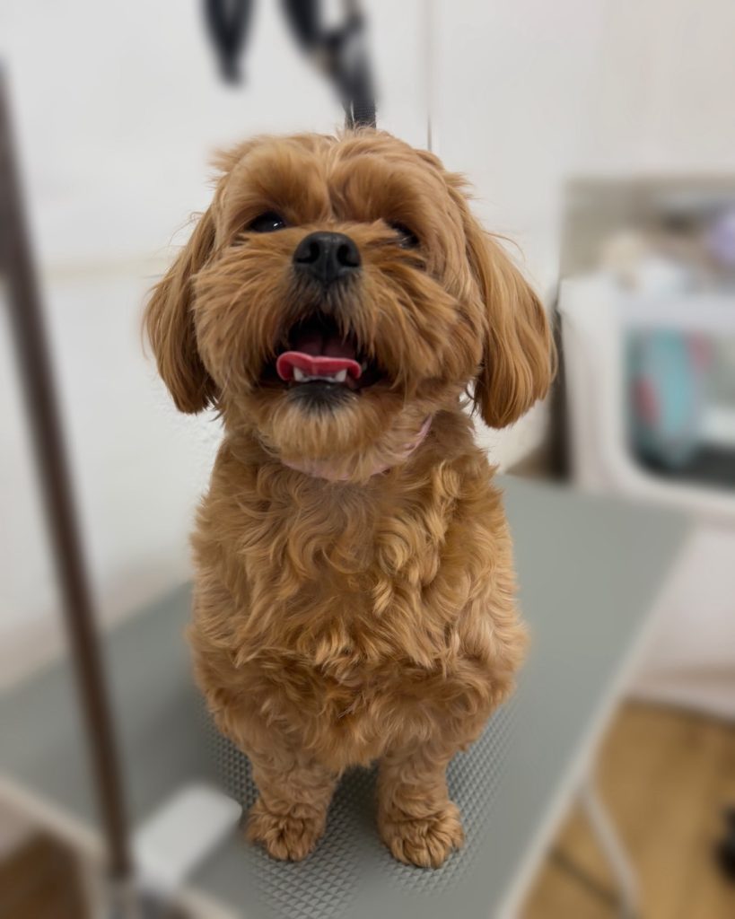 今回のオーダーは、全身6.4mm、四肢先3.2mm並(足止めする)、お顔まあるく、マズルふんわりまあるく、目周り短め、お口に入る毛短め、お耳顎ラインでそろえる、しっぽ2cmカットで扇形、まつげ残し、高濃度炭酸泉スパコースでした。