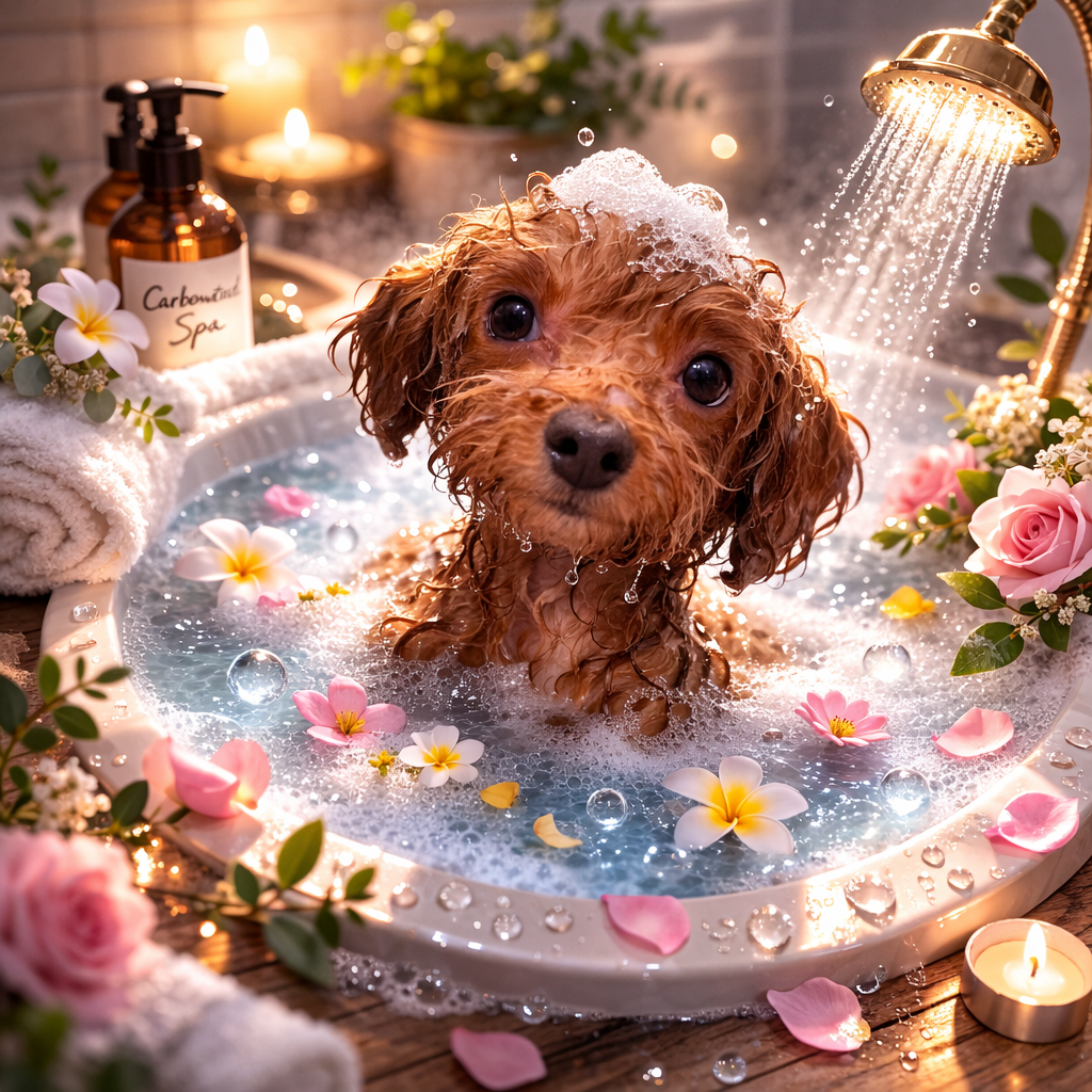 シャンプーコース+お顔カット+高濃度炭酸泉スパコースでコアくん。さ~っぱりしました。ヾ(≧▽≦*)o