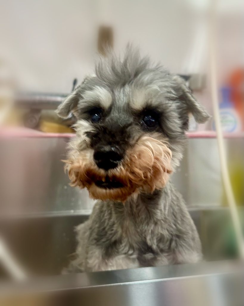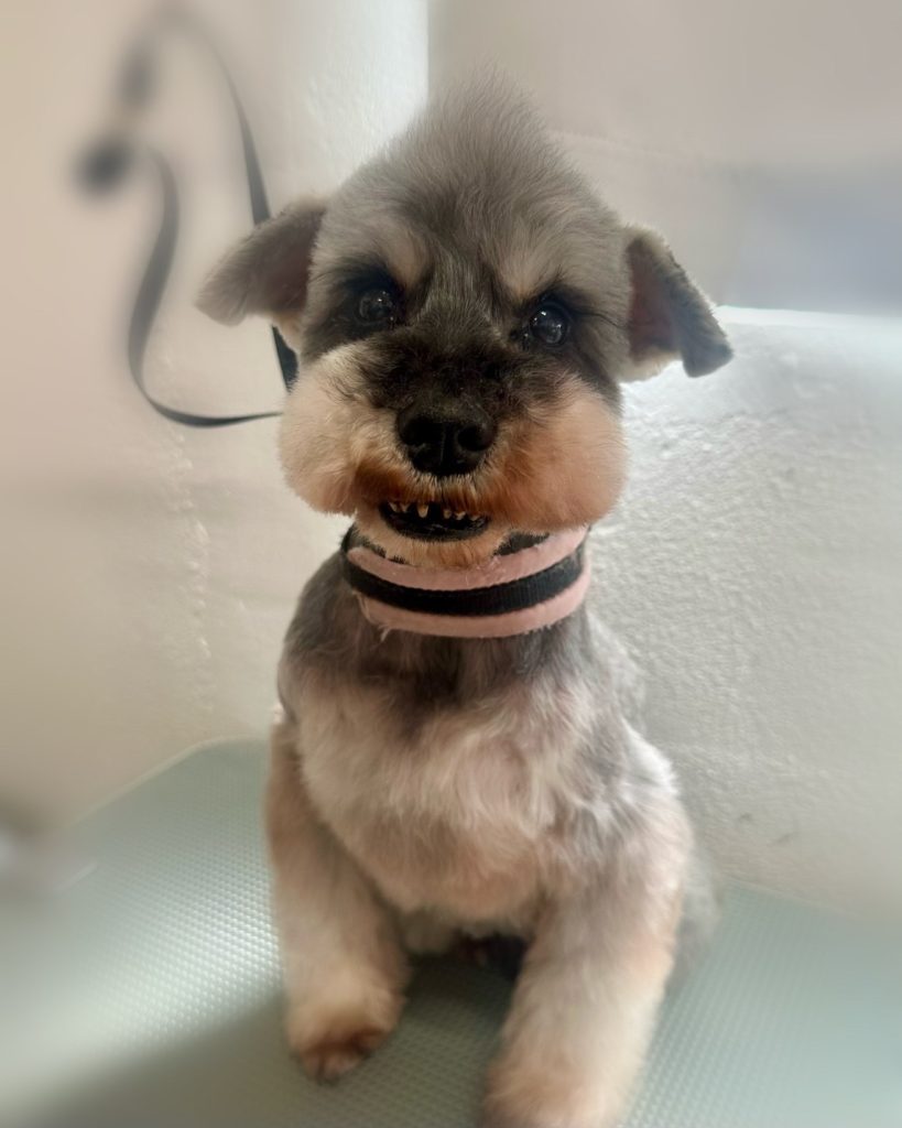 今回のオーダーは、お体2mmシュナライン、四肢細めストレート、お顔シュナウザーカット、お口周り小さめでまあるく、眉一体化、頭ソフトモヒカン、お耳&しっぽ2mm、まつげ2.5cm残しでした。
